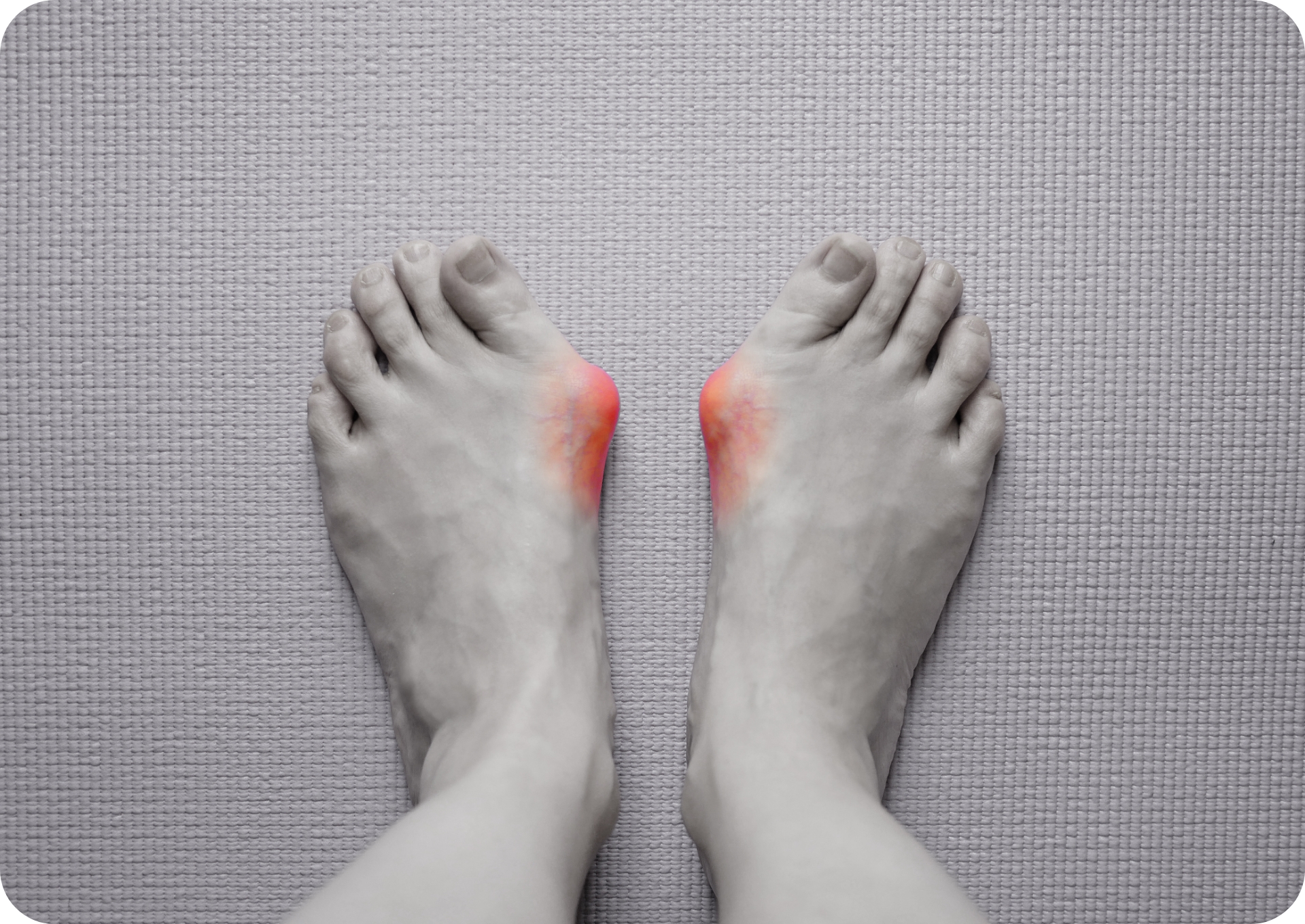 外反母趾では、足の親指の付け根にある関節が突出するようになり、足に合わない靴を履くと、突出した部分が擦れて炎症が起こることがあります。