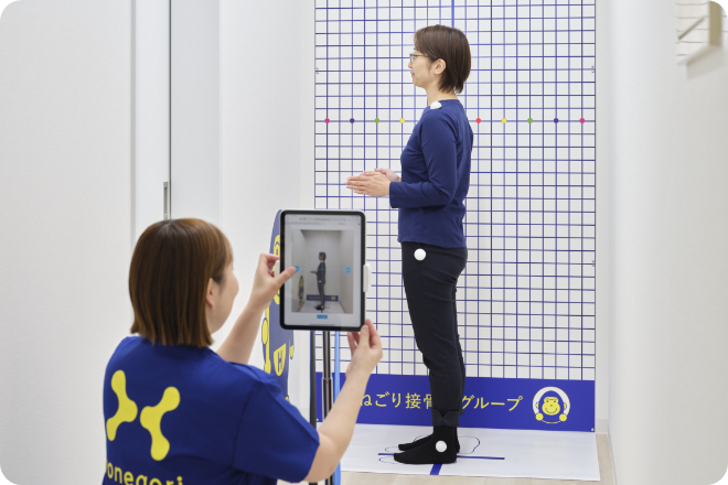 当グループでは、施術前に姿勢のチェックを行います。 今の姿勢を見てもらうことにより、貴方の姿勢の歪みのある部分に気が付いてもらえると思います。 お互いにしっかりチェックをしながら、その部分を解消する説明と施術を行うので、安心して受けていただけるかと思います。 また、ビフォーアフターもチェックします。 1回で効果を実感して頂いておりますが、一時的なもので戻りやすくなっているため、良い姿勢が当たり前になることを目指します。