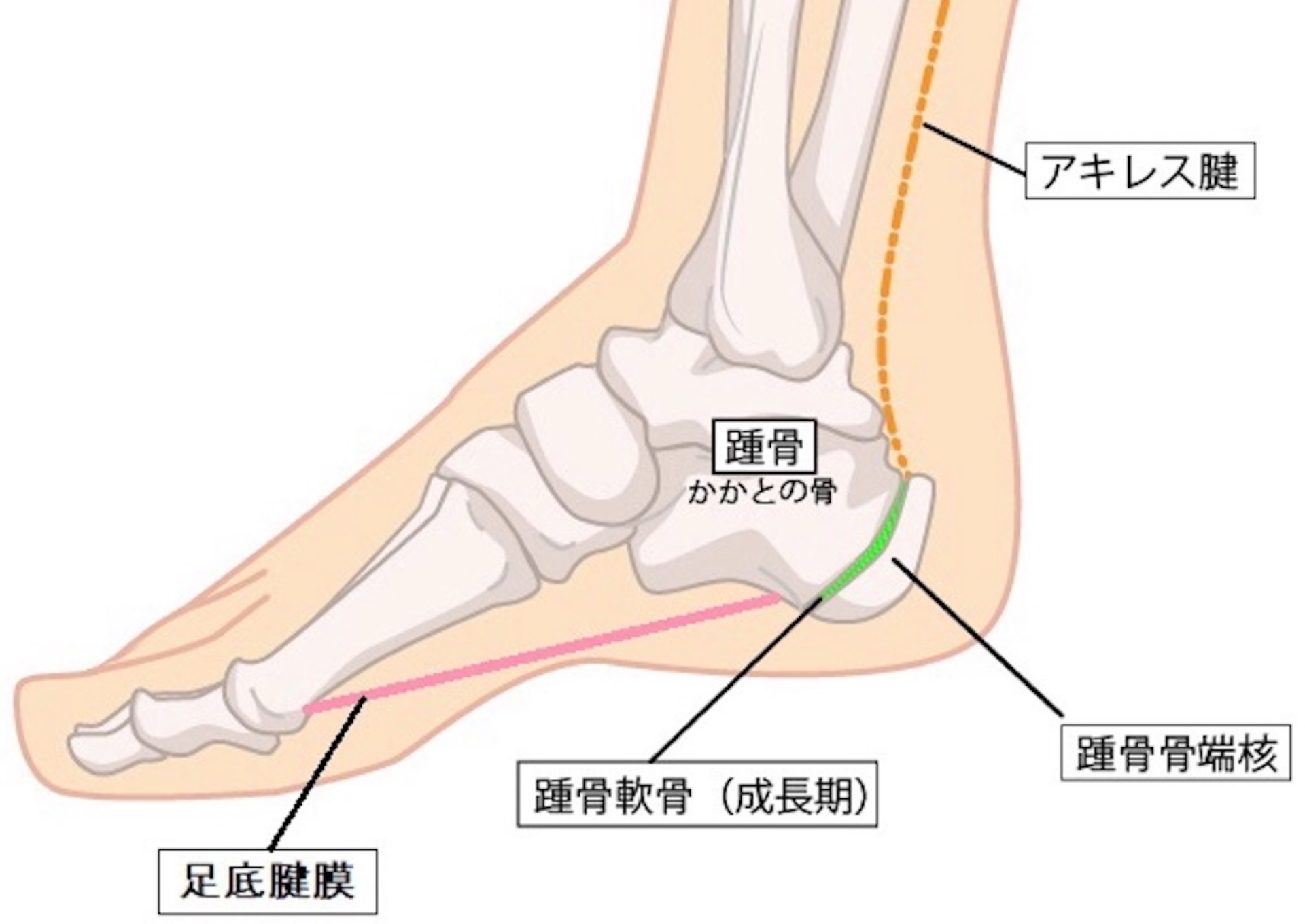 かかとの骨である「踵骨」は、成長の過程で一つのしっかりとした骨になっていきますが、成長期までは「踵骨骨端核(しょうこつこったんかく)」「成長軟骨」に分かれており、構造上非常に脆い状態にあります。