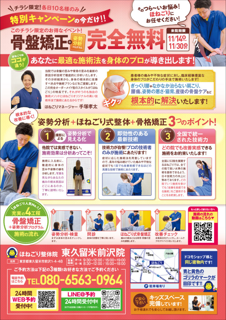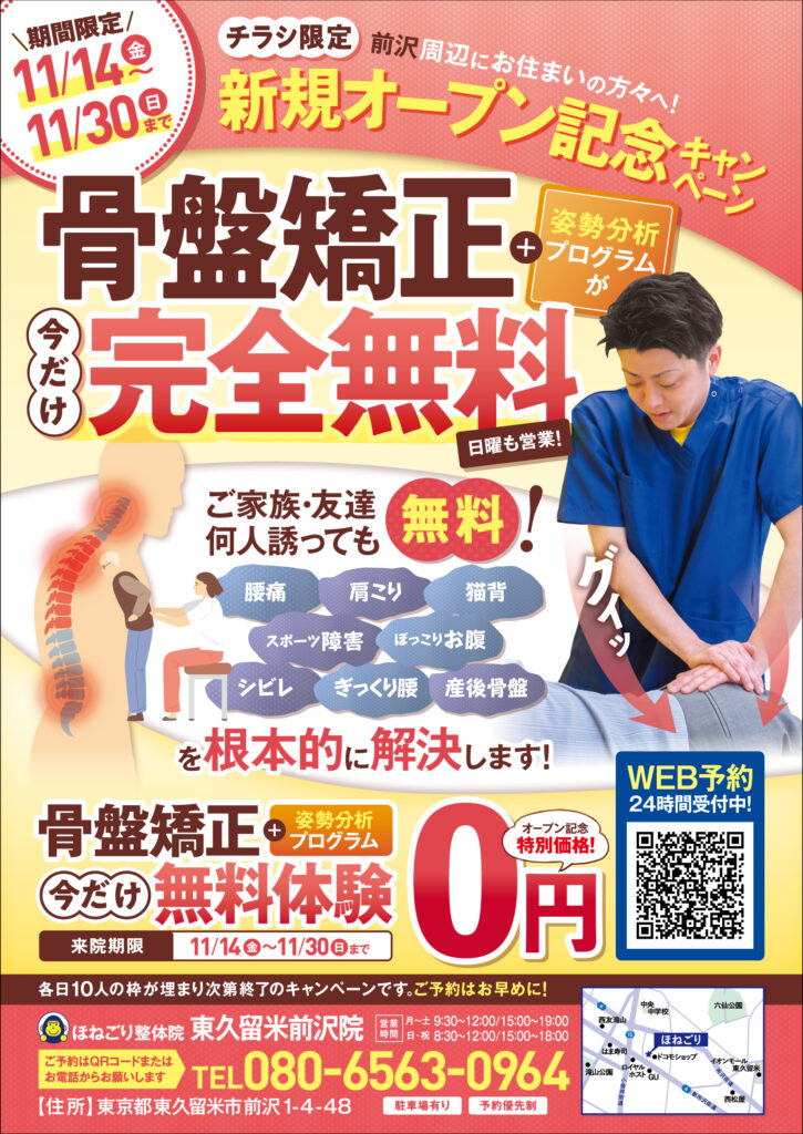 オープンを記念し、人気の「骨盤矯正」や「猫背矯正」などをお試しいただける無料施術体験会を期間限定で開催いたします。この機会にぜひ、ほねごりの施術をご体感ください。
