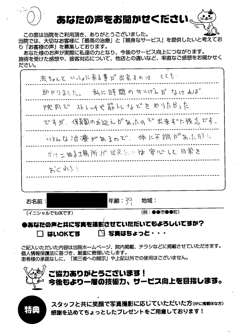 私に時間の制限がなければ、院内でストレッチや筋トレなどやりたかったですが、保育園のお迎えがあったので出来ずに残念です。