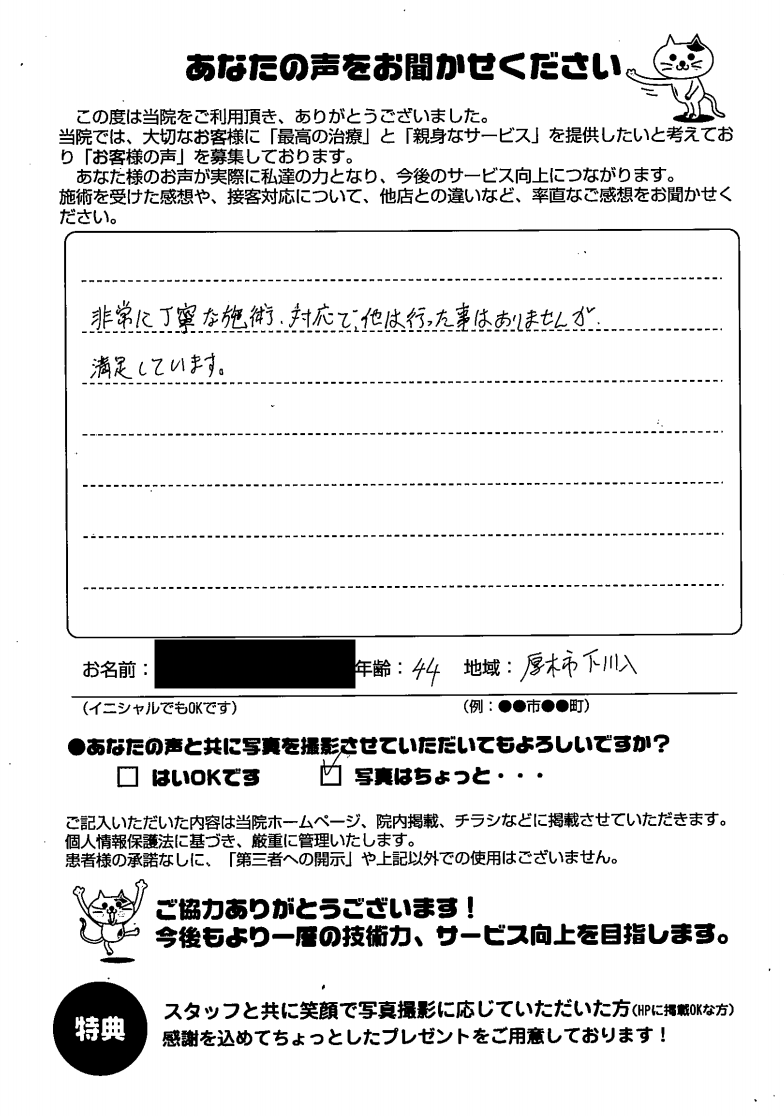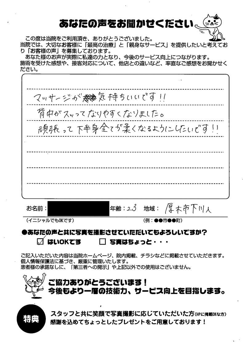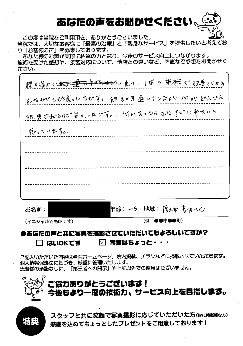 腰の痛みが出て、1回の施術で改善がみられたのでとても良かったです。