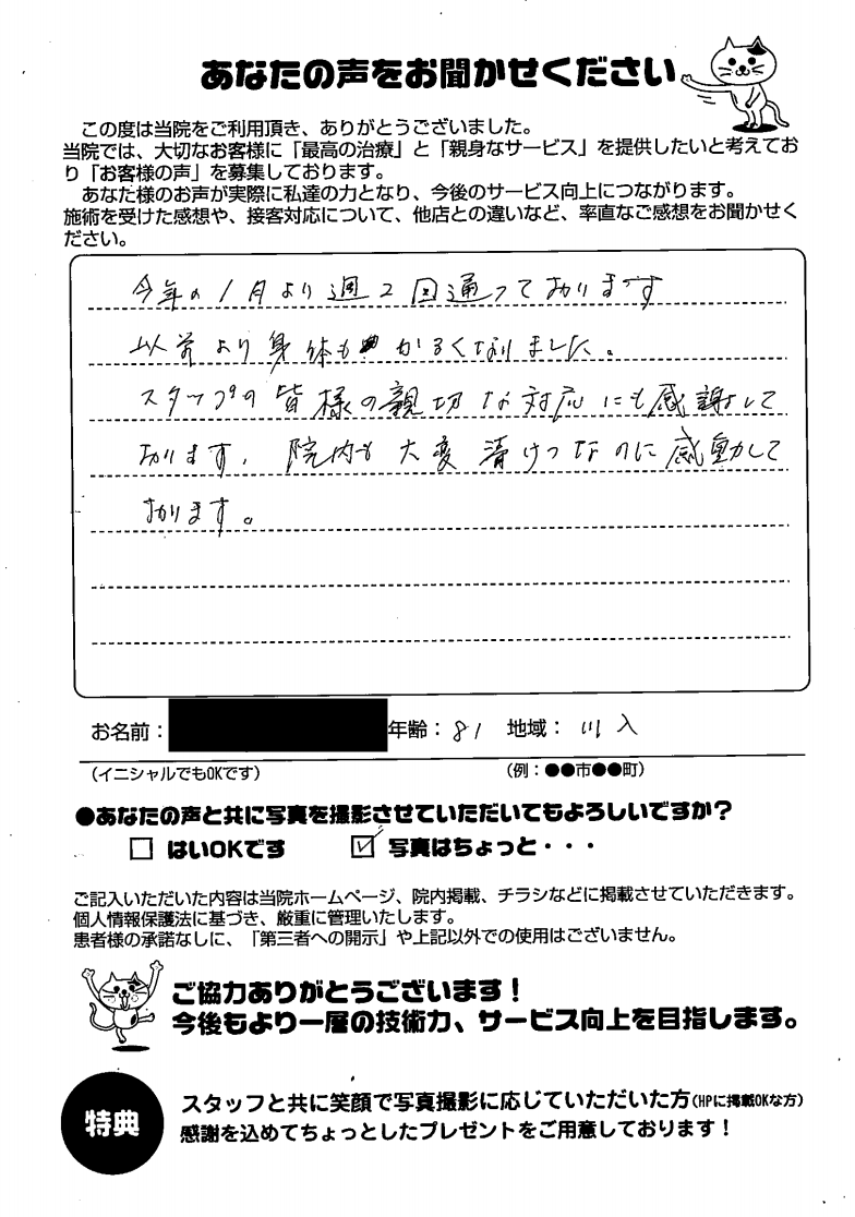 先生方が私の体の状態をよく知ってくださっているので、来た時にここが痛いというとすぐやってくださるので、それがいいなと思い、通い続けています。