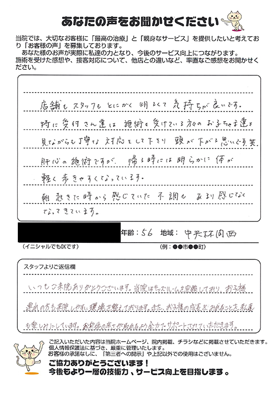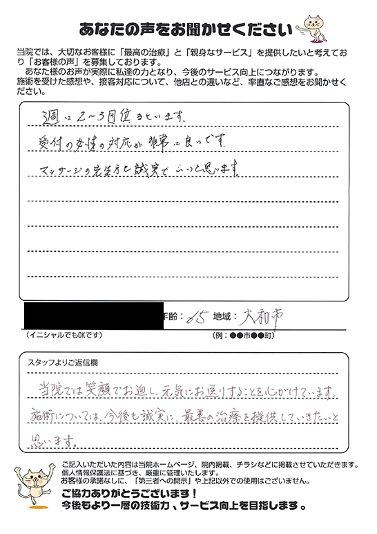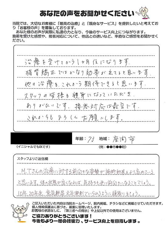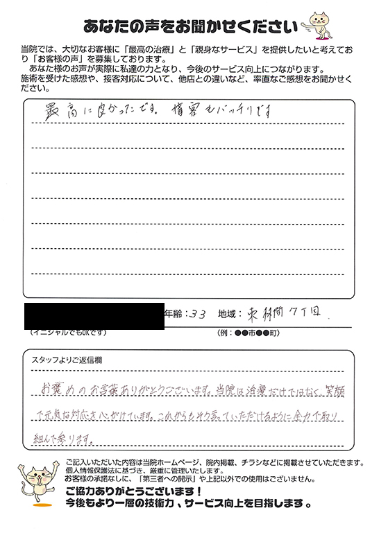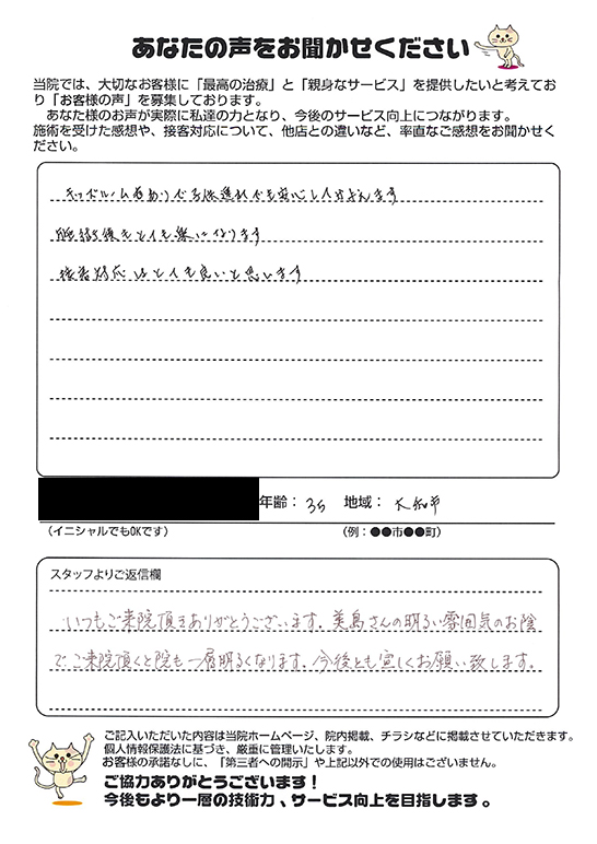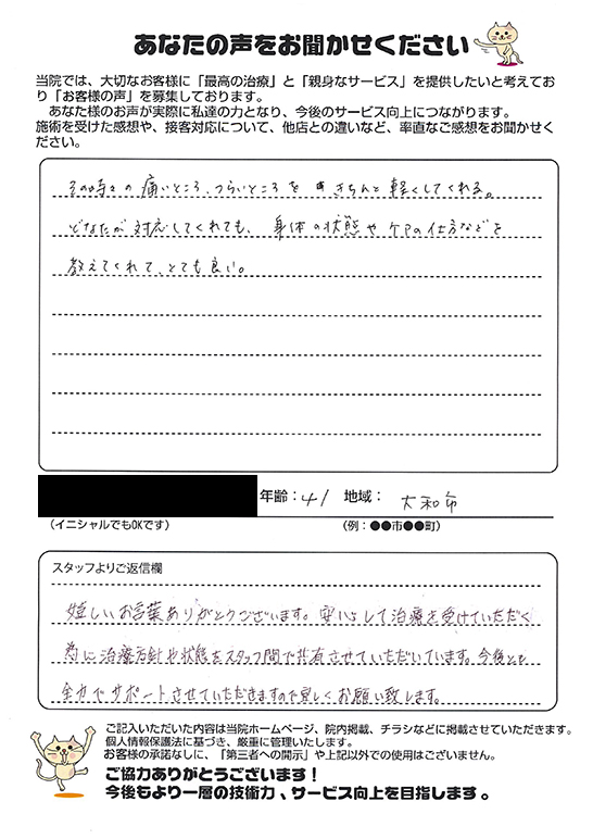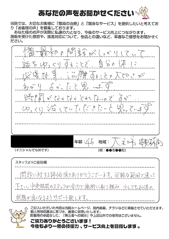 一番最初の問診がしっかりしていて話をゆっくりすることで、自分の体に必要な事、治療することの大切さがわかりよかったと思います。