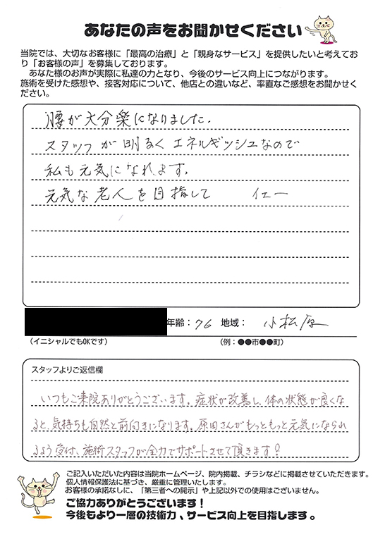 つらかった痛みがなくなっていい状態が続くようになってすごい楽になりました。