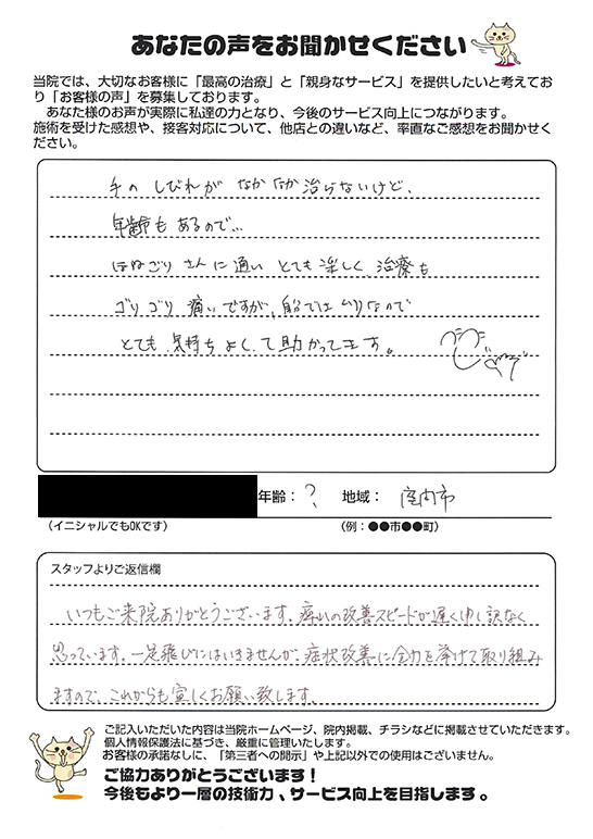 ほねごりさんに通いとても楽しく治療もゴリゴリ痛いですが、自分では無理なのでとても気持ちよく助かってます。