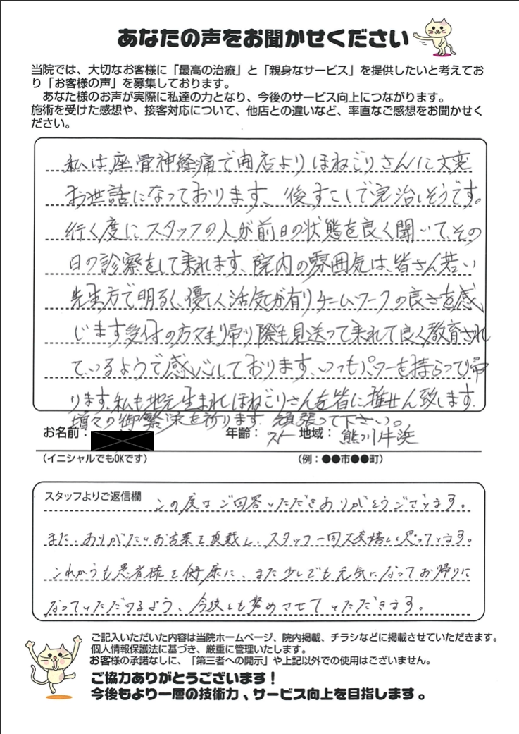 私は坐骨神経痛で開店よりほねごりさんに大変お世話になっております。