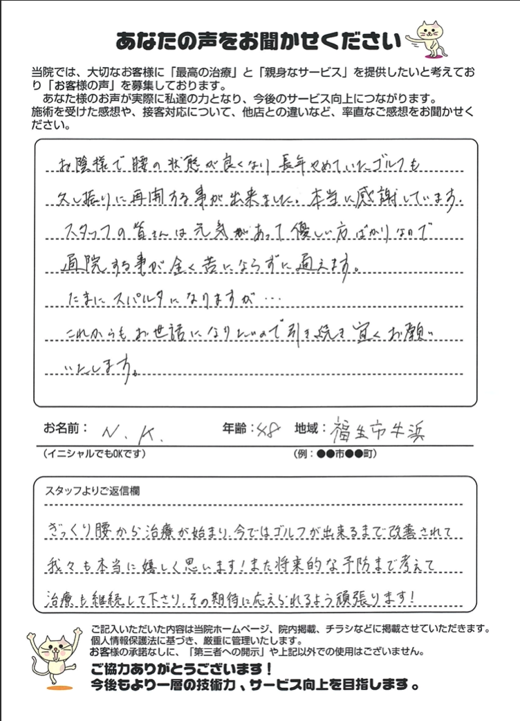 お陰様で腰の状態も良くなり、長年やめていたゴルフも久し振りに再開する事が出来ました。