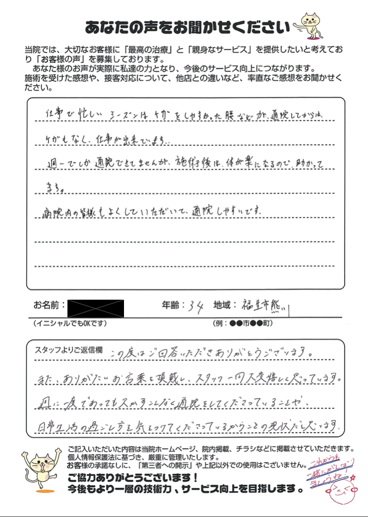 仕事で忙しいシーズンはケガをしやすかった腰などが、通院してからはケガもなく、仕事ができています。
