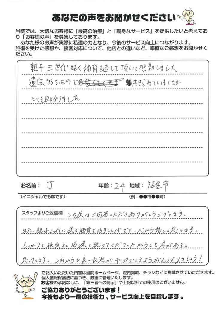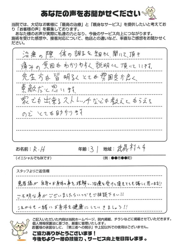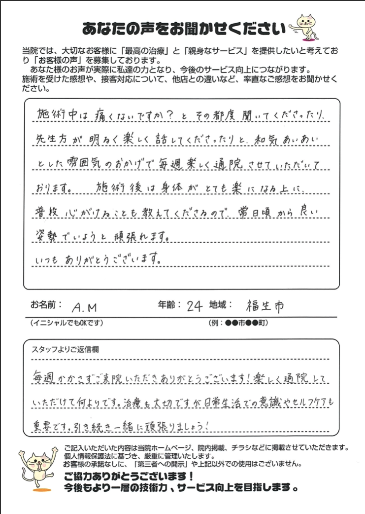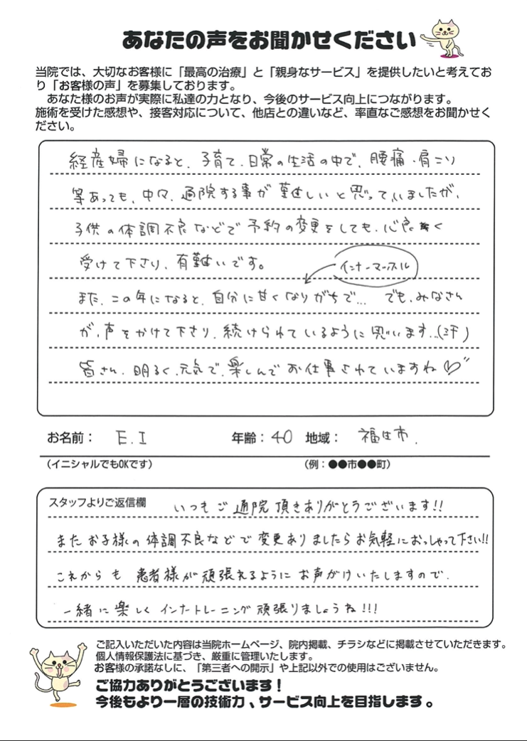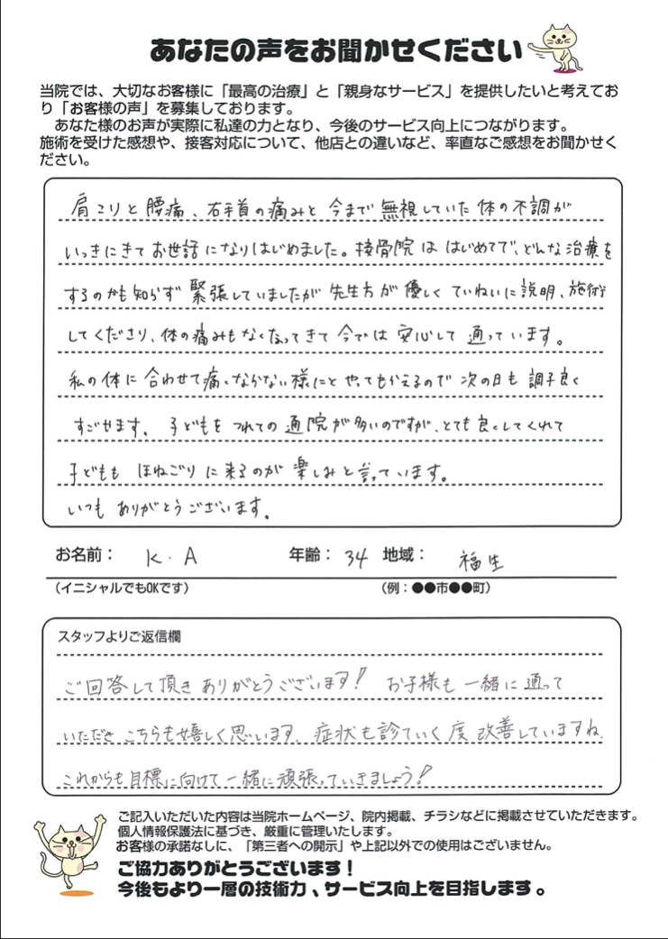 経産婦になると、子育て、日常の生活の中で、腰痛、肩こり等あっても、中々通院する事が難しいと思っていましたが、子供の体調不良などで予約の変更をしても、心良く受けてくださり有難いです。