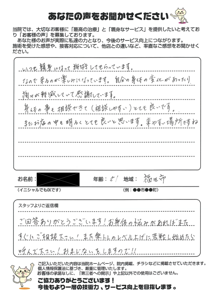 接骨院は初めてで、どんな治療をするのかも知らず緊張していましたが、先生方が優しく丁寧に説明、施術してくださり、体の痛みもなくなってきて、今では安心して通っています。