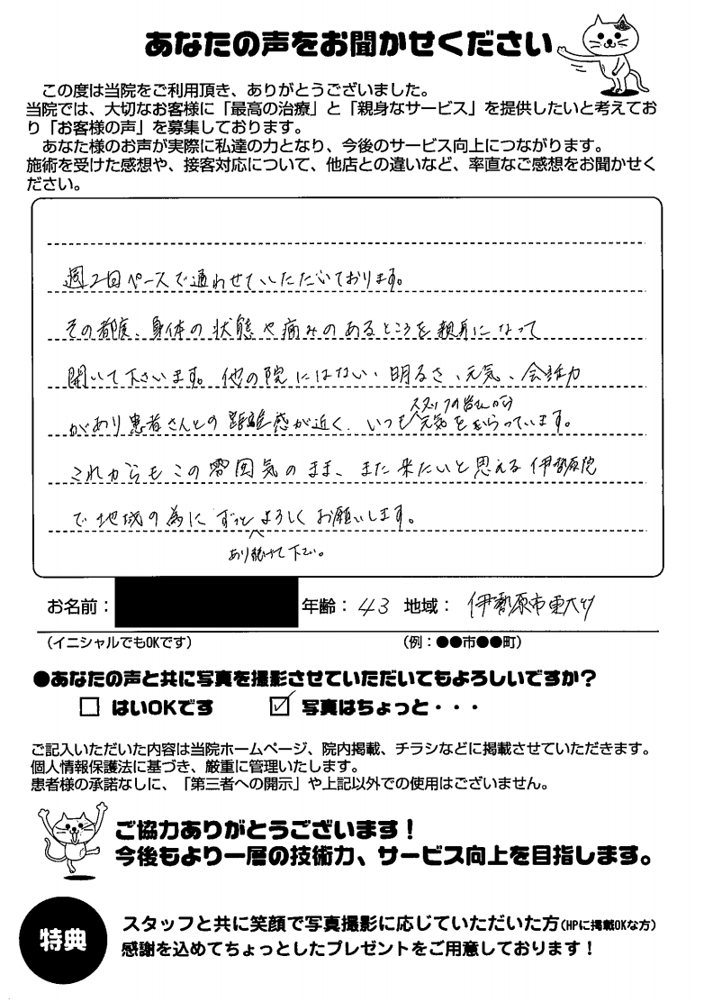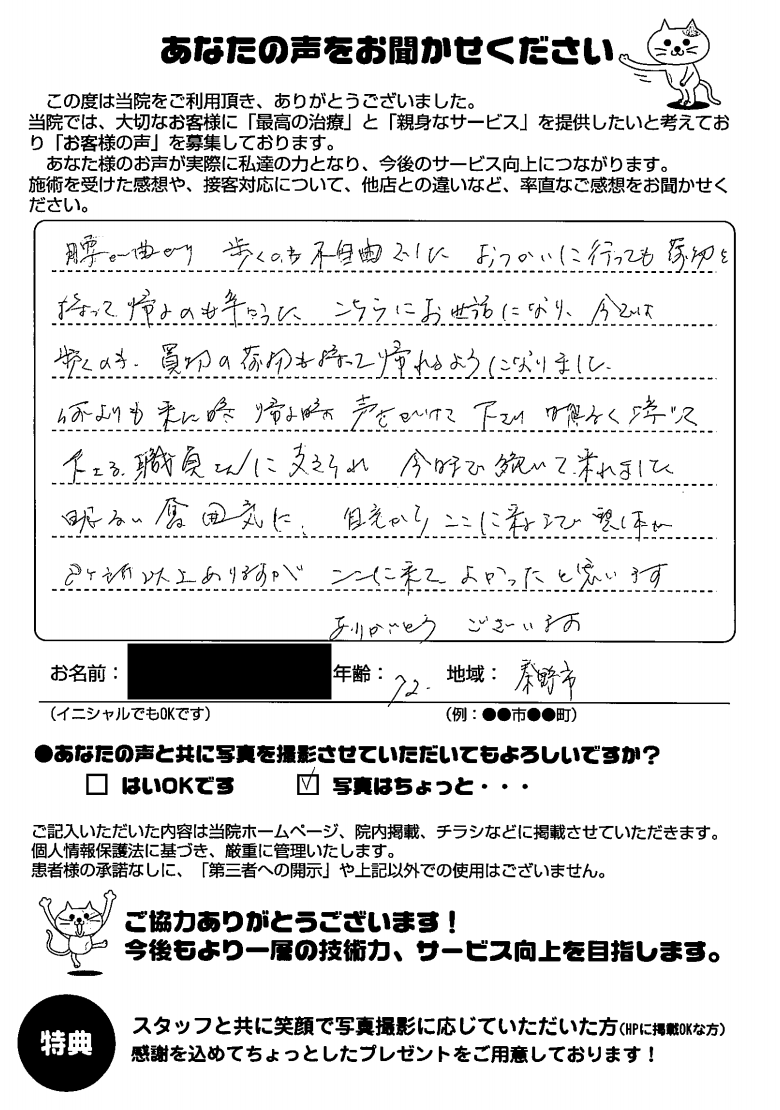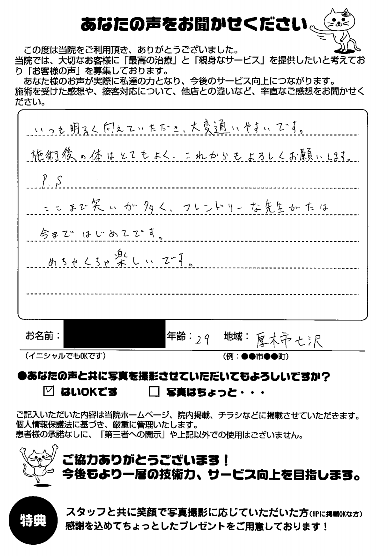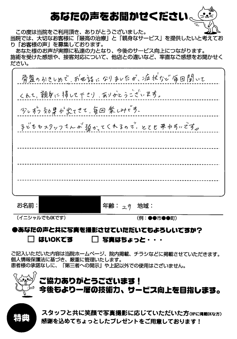 骨盤の引きしめでお世話になりましたが、症状など毎回聞いてくれて、親身に接してくださり、ありがとうございます。