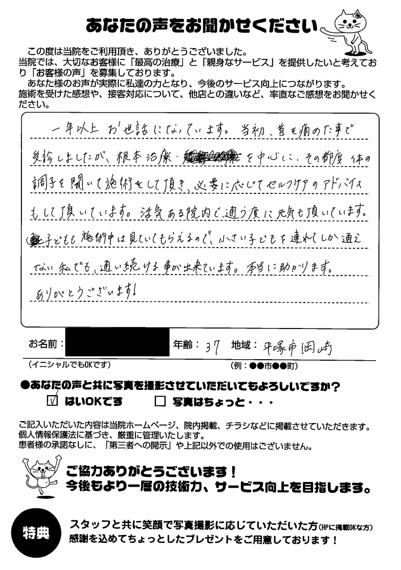 子どもも施術中は見てもらえるので、小さい子どもを連れてしか通えない私でも、通い続ける事が出来ています。
