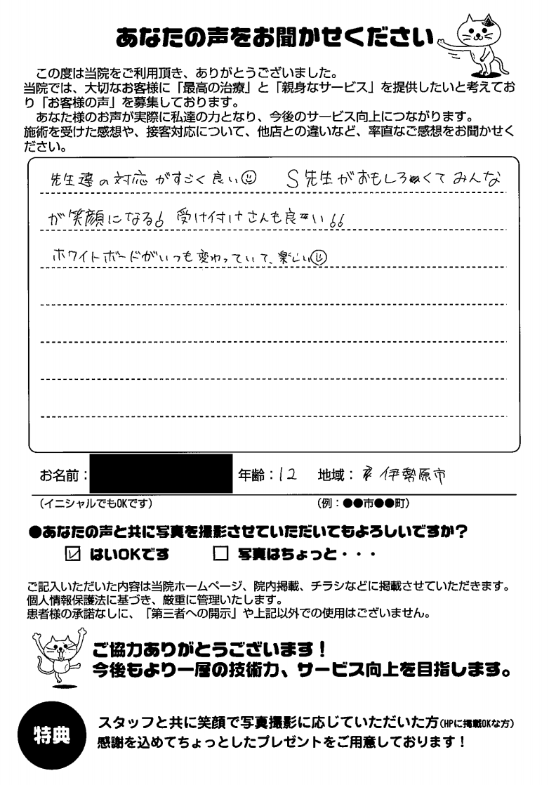 いつも、小学生の娘を2人連れて来院しますが先生方も受付の方も温かく、子供達にも声を掛けて下さり、有りがたいです。