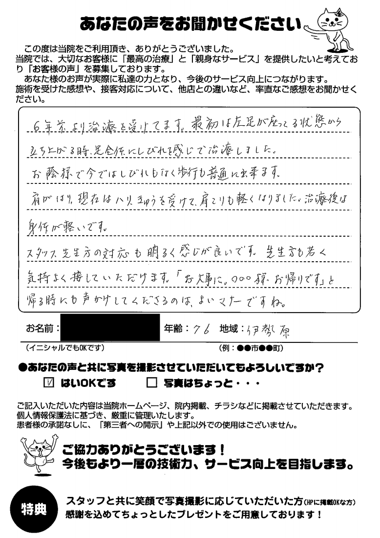 当初、首を痛めた事で受診しましたが、根本治療を中心に、その都度体の調子を聞いて施術をして頂いています。