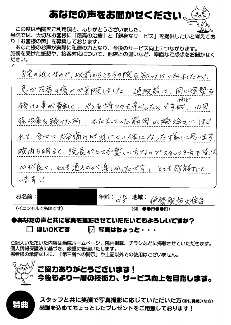 肩が張り、現在ははりきゅうを受けて、肩こりも軽くなりました。