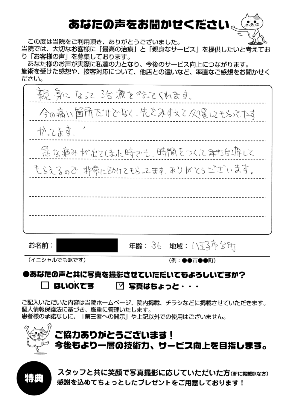 急な痛みが出てしまった時でも、時間をつくって治療してもらえるので、非常に助けてもらってます。
