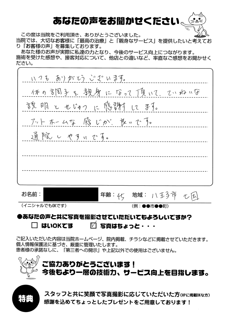 腰の痛みや膝の痛みと来院するたびに変わってしまいますが、そのつど対応してくださいます。