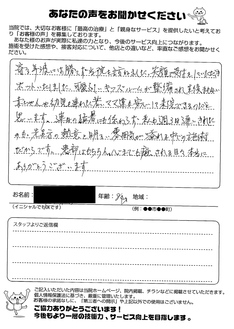寄る年波には勝てず当院を訪ねました。笑顔で受付をしていただきホッとしました。