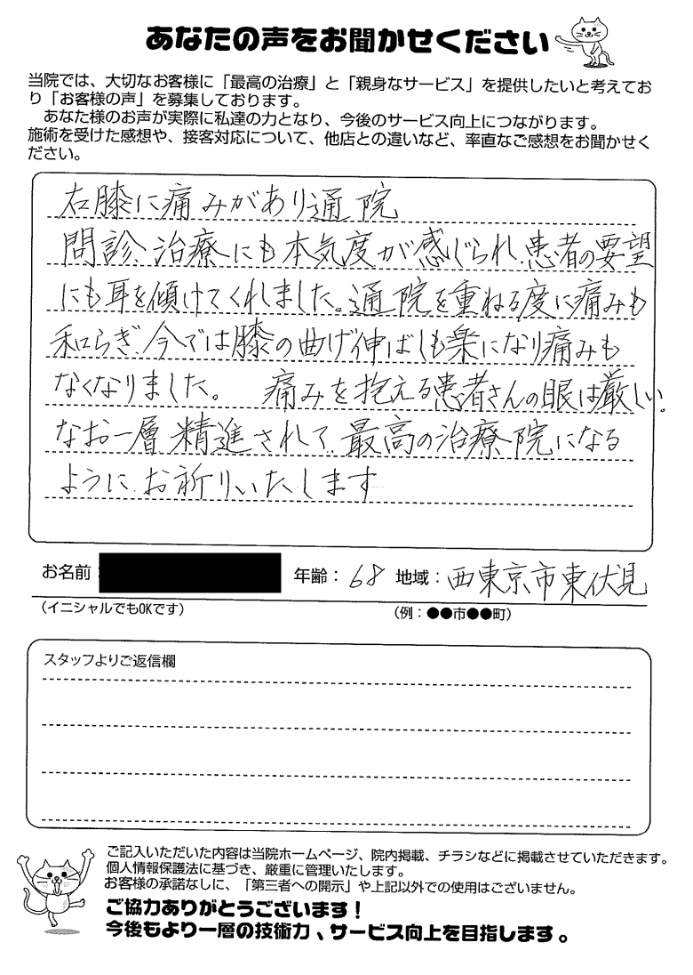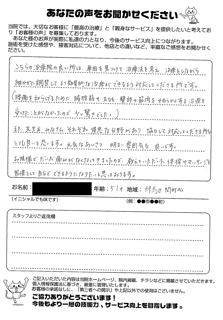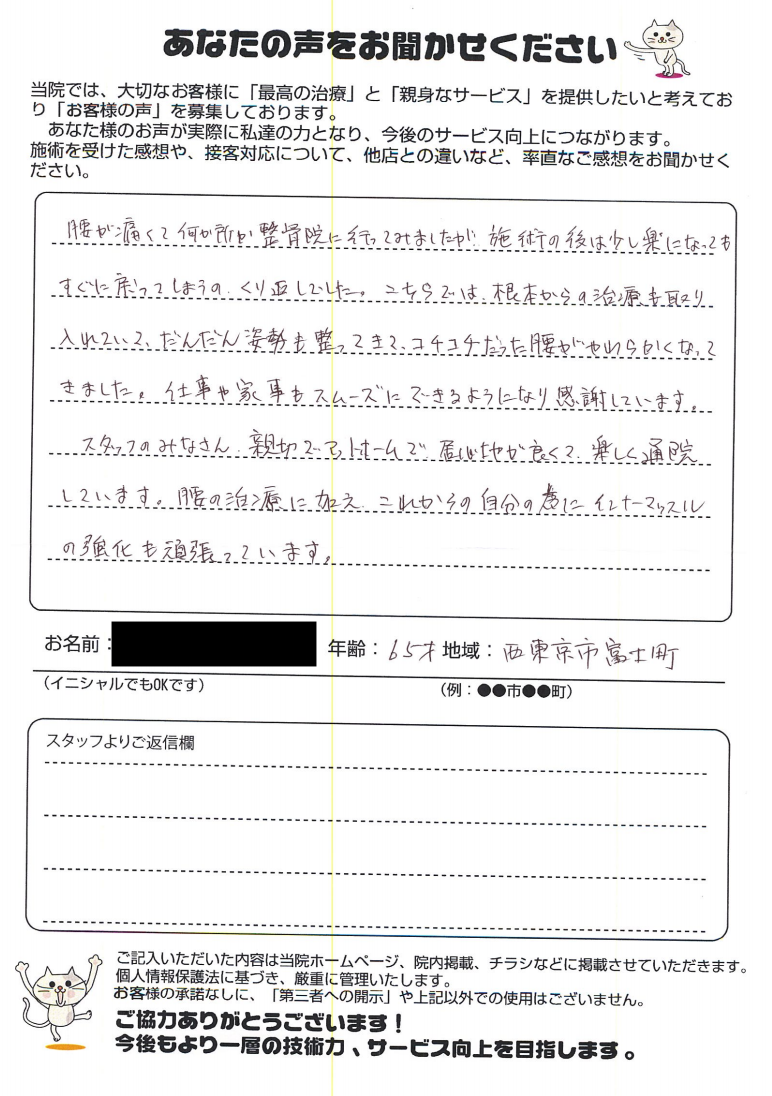 お陰様でだいぶ痛みがなくなってきましたので、教えていただいた体操やマッサージを習慣として自分でできるようになりたいと思っております。