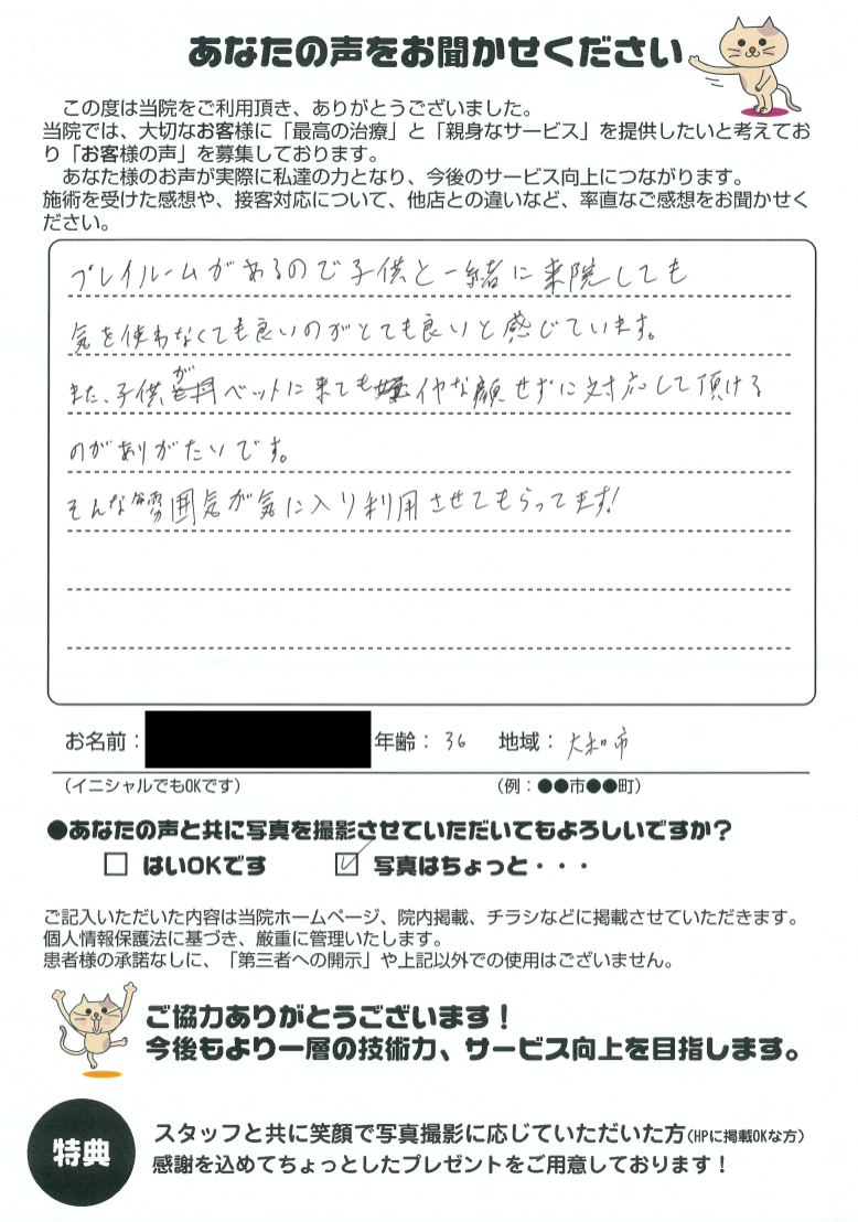 プレイルームがあるので子供と一緒に来院しても気を使わなくても良いのがとても良いと感じています。