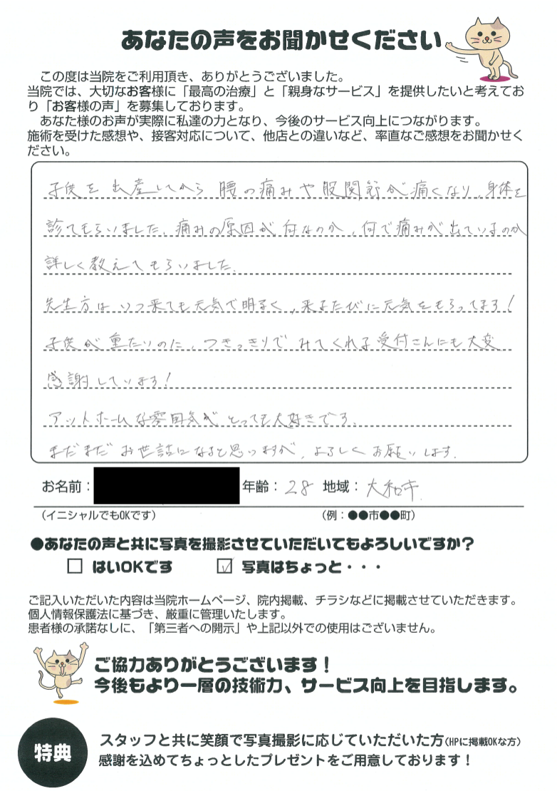 子供を出産してから腰の痛みや股関節が痛くなり、身体を診てもらいました。