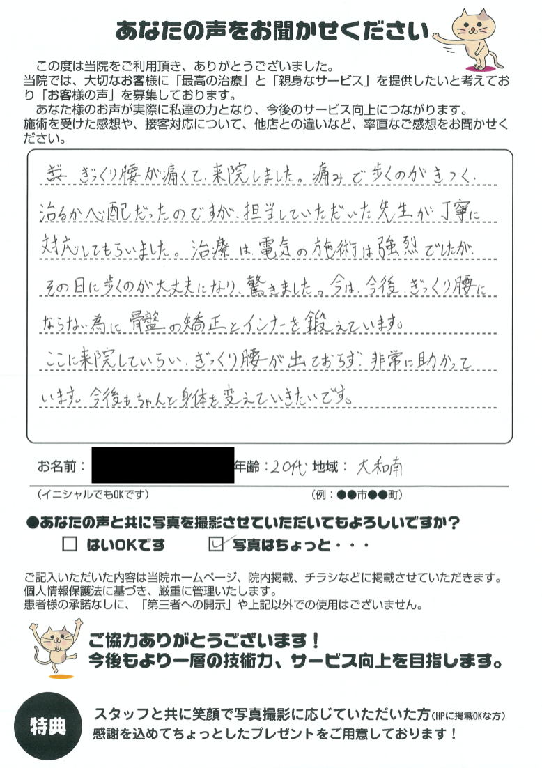 治療は電気の施術は強烈でしたが、その日に歩くのが大丈夫になり驚きました。
