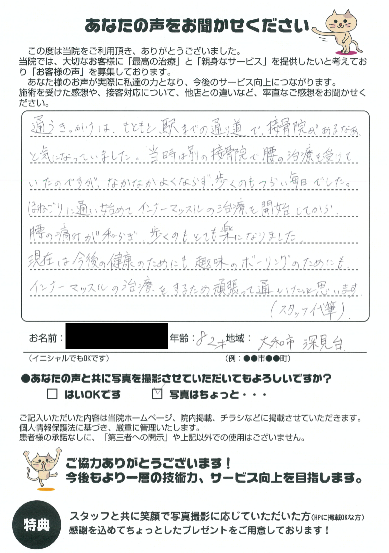 ほねごりに通い始めてインナーマッスルの治療を開始してから、腰の痛みが和らぎ、歩くのがとても楽になりました。