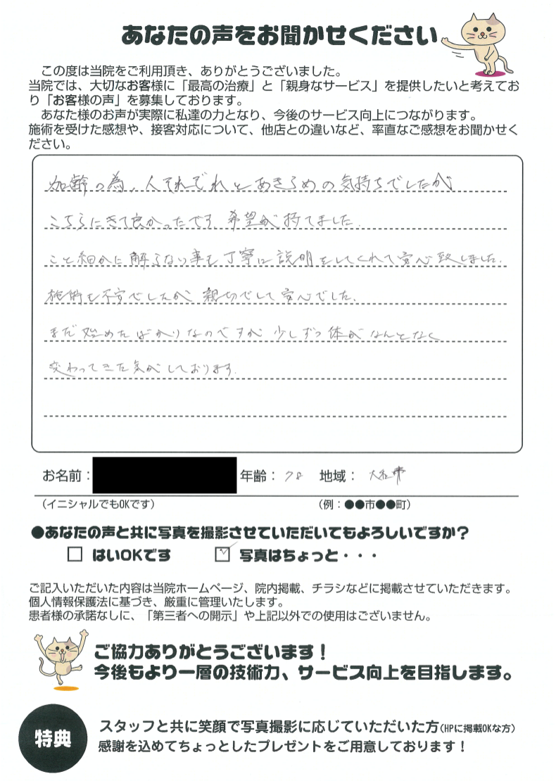 加齢の為、人それぞれとあきらめの気持ちでしたが、こちらに来て良かったです。
